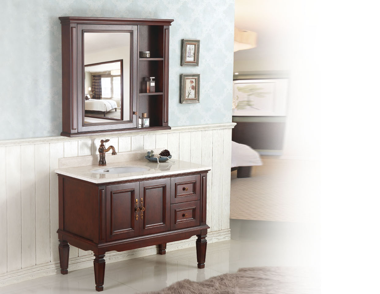 说明:售后服务,五金件5年,柜子、人造石、台盆3年,镜子1年
